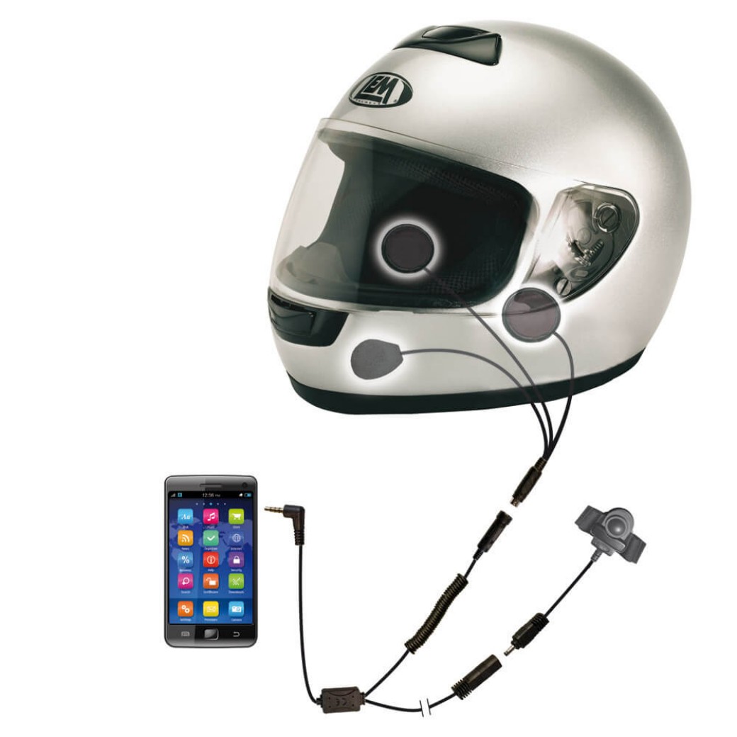Stereo Headset für Motorradhelme. Passend für alle Smartphones (iPhone, Samsung, HTC, Huawei, etc.) mit 3.5mm Audio-Buchse. Mit Mikrofon und Funktionstaste z.B. zur Gesprächsannahme und MP3 Player Steuerung.